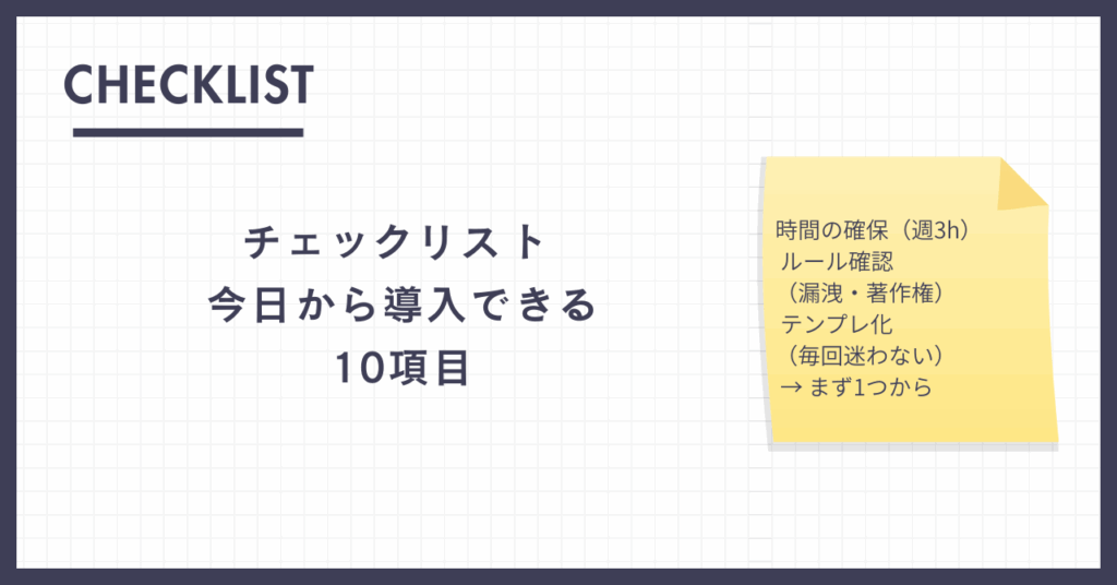 週3時間の回し方/成果物3つ/安全運用(社内ルール・入力NG・匿名化・著作権)をセットで整理します。