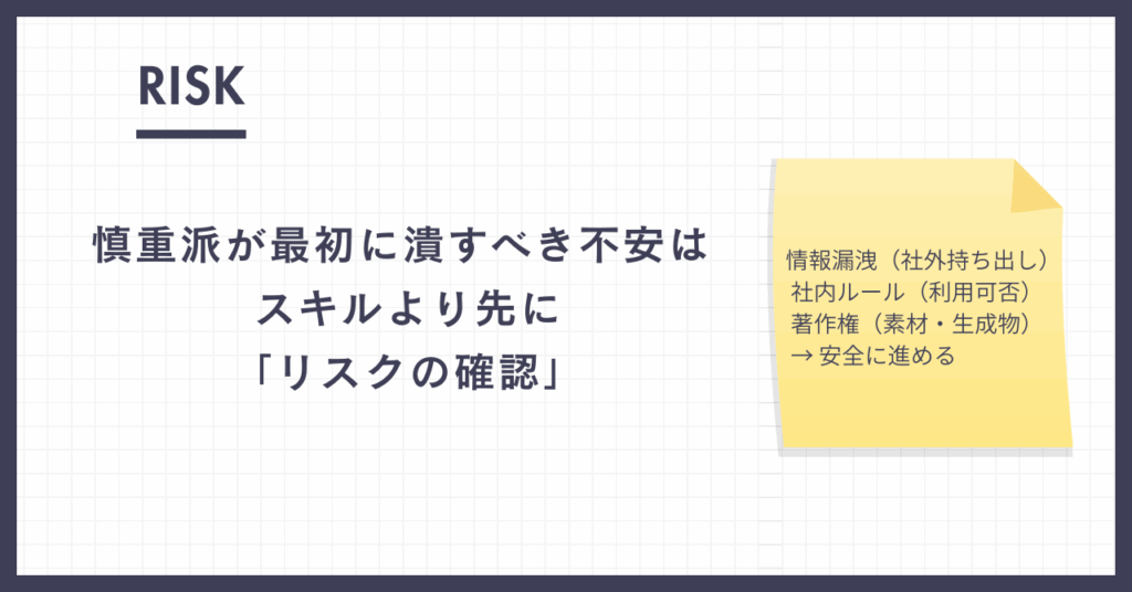 - 慎重派の不安(情報漏洩・社内ルール・著作権)は、先に潰せば安全に使える