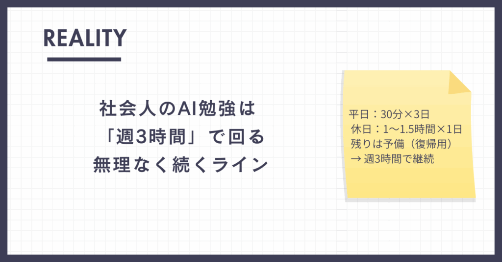 - 社会人のAI勉強は、週3時間で回せる。鍵は「学習」より「仕事に当てる」設計