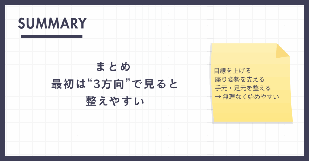 また、グッズだけで整えようとせず、机まわりや姿勢も一緒に見直すと続きやすくなります。