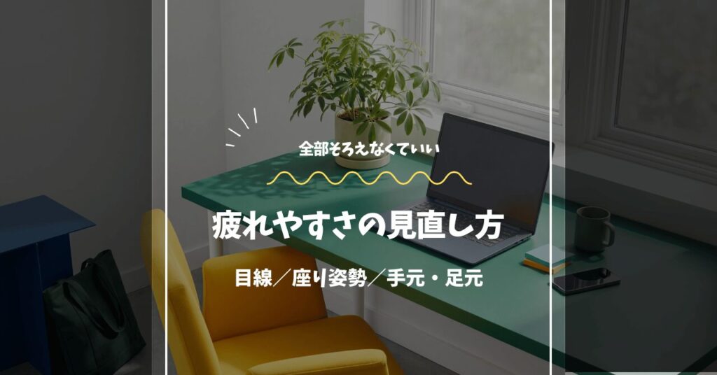 デスクワークで疲れにくくしたいなら、最初は「目線」「座り姿勢」「手元・足元」の3方向で考えると分かりやすいです。