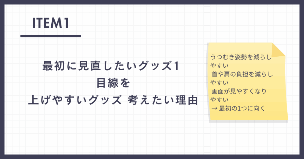 ノートパソコン中心の人は、まず目線を上げやすいグッズから考えると整理しやすいです。