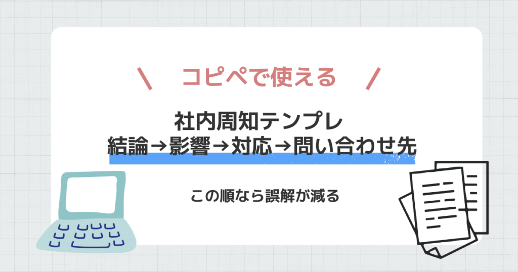 「結論→影響→対応→問い合わせ先」の順に固定すると、誤解が減って問い合わせの往復も減ります。件名は「【周知】◯◯について(開始:◯/◯)」のように、開始日(または期限)を先に見せるのがおすすめです。