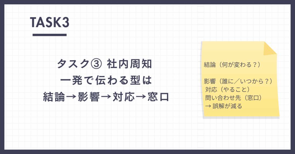 - 社内周知:結論→影響→対応→問い合わせ先で伝える