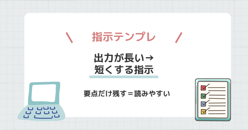 「この順番で」「箇条書き中心で」「丁寧語で」など、形式を固定するほど安定します。